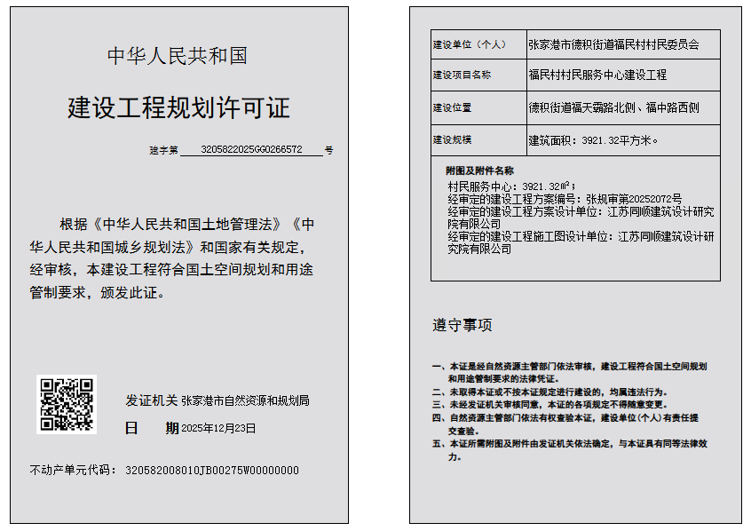 建設工程規劃許可證:張家港市德積街道福民村村民委員會福民村村民服務中心建設工程