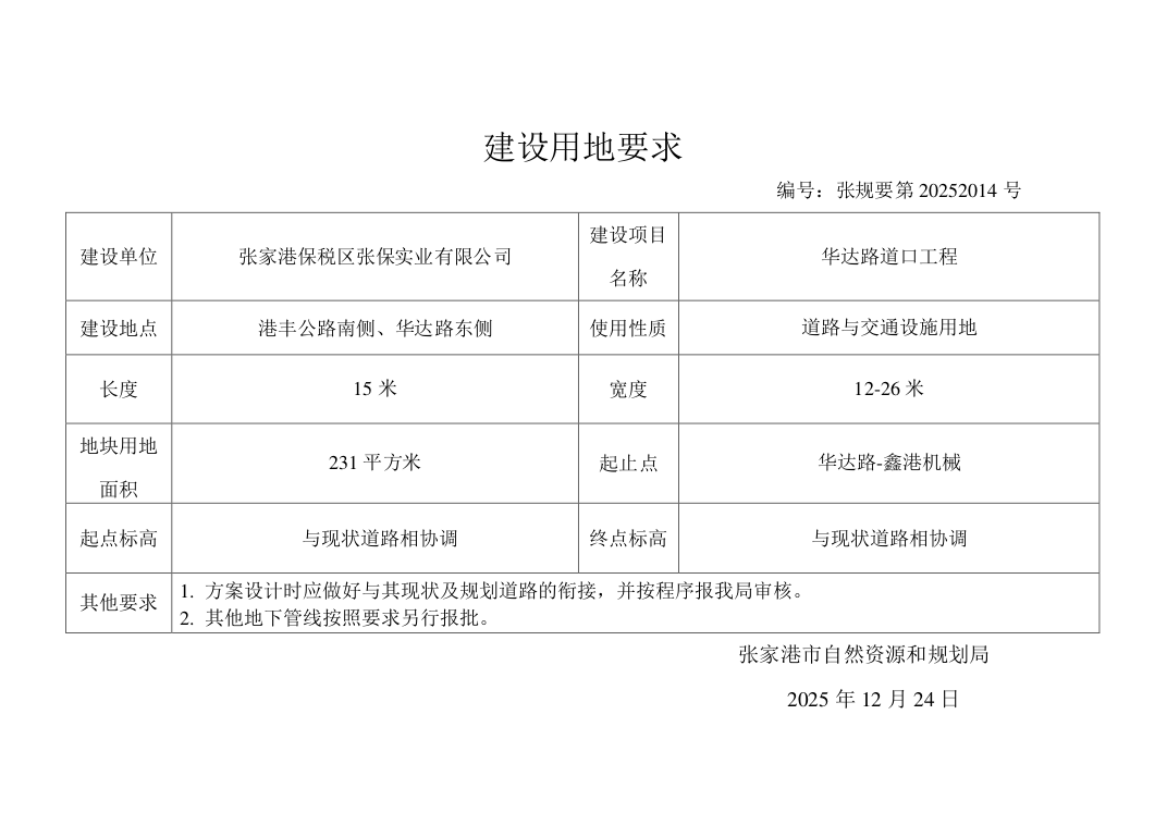 建設(shè)項目用地預(yù)審與選址意見書:張家港保稅區(qū)張保實業(yè)有限公司華達路道口工程