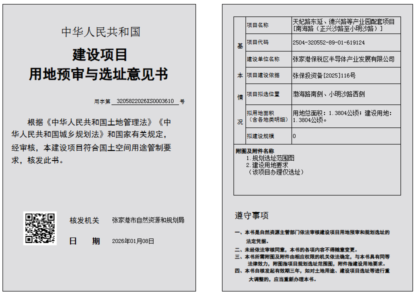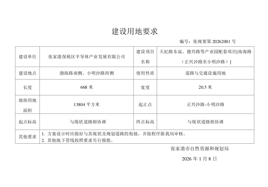 建設項目用地預審與選址意見書:張家港保稅區半導體產業發展有限公司天妃路東延、德興路等產業園配套項目[南海路(正興沙路至小明沙路)]
