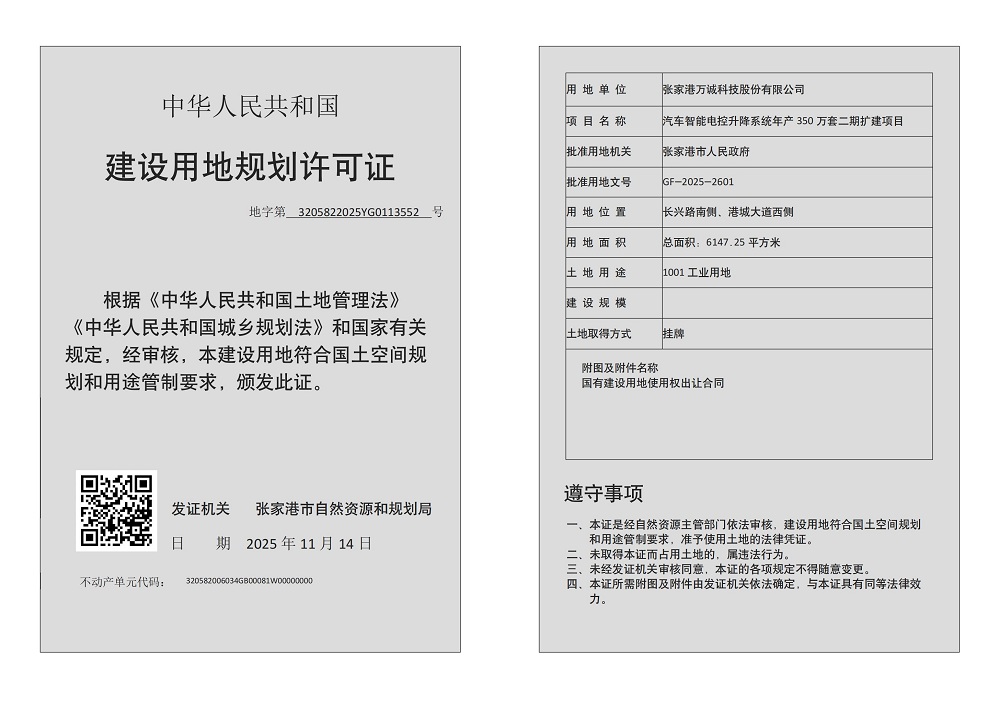 建設(shè)用地規(guī)劃許可證:張家港萬(wàn)誠(chéng)科技股份有限公司汽車智能電控升降系統(tǒng)年產(chǎn)350萬(wàn)套二期擴(kuò)建項(xiàng)目