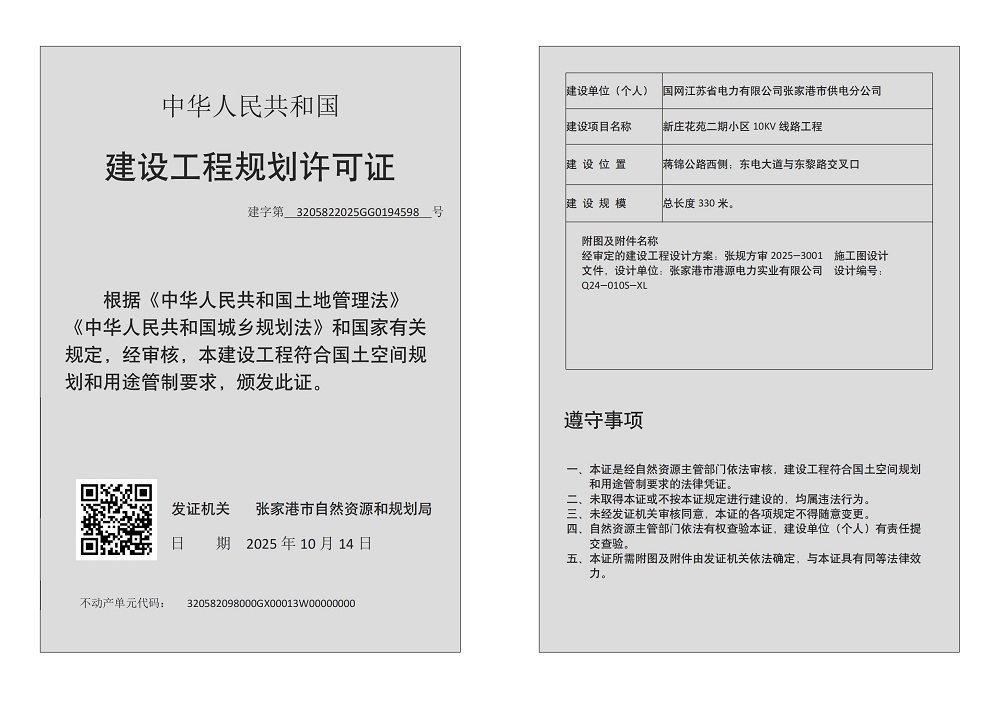 建設工程規劃許可證:國網江蘇省電力有限公司張家港市供電分公司新莊花苑二期小區10KV線路工程