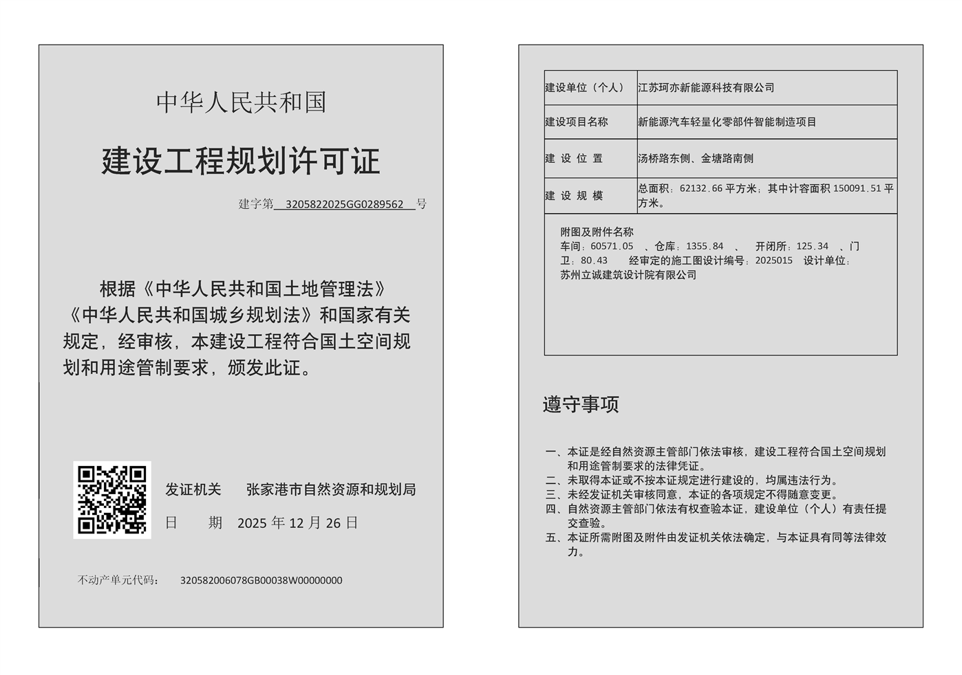 建設(shè)工程規(guī)劃許可證:江蘇珂亦新能源科技有限公司新能源汽車輕量化零部件智能制造項(xiàng)目