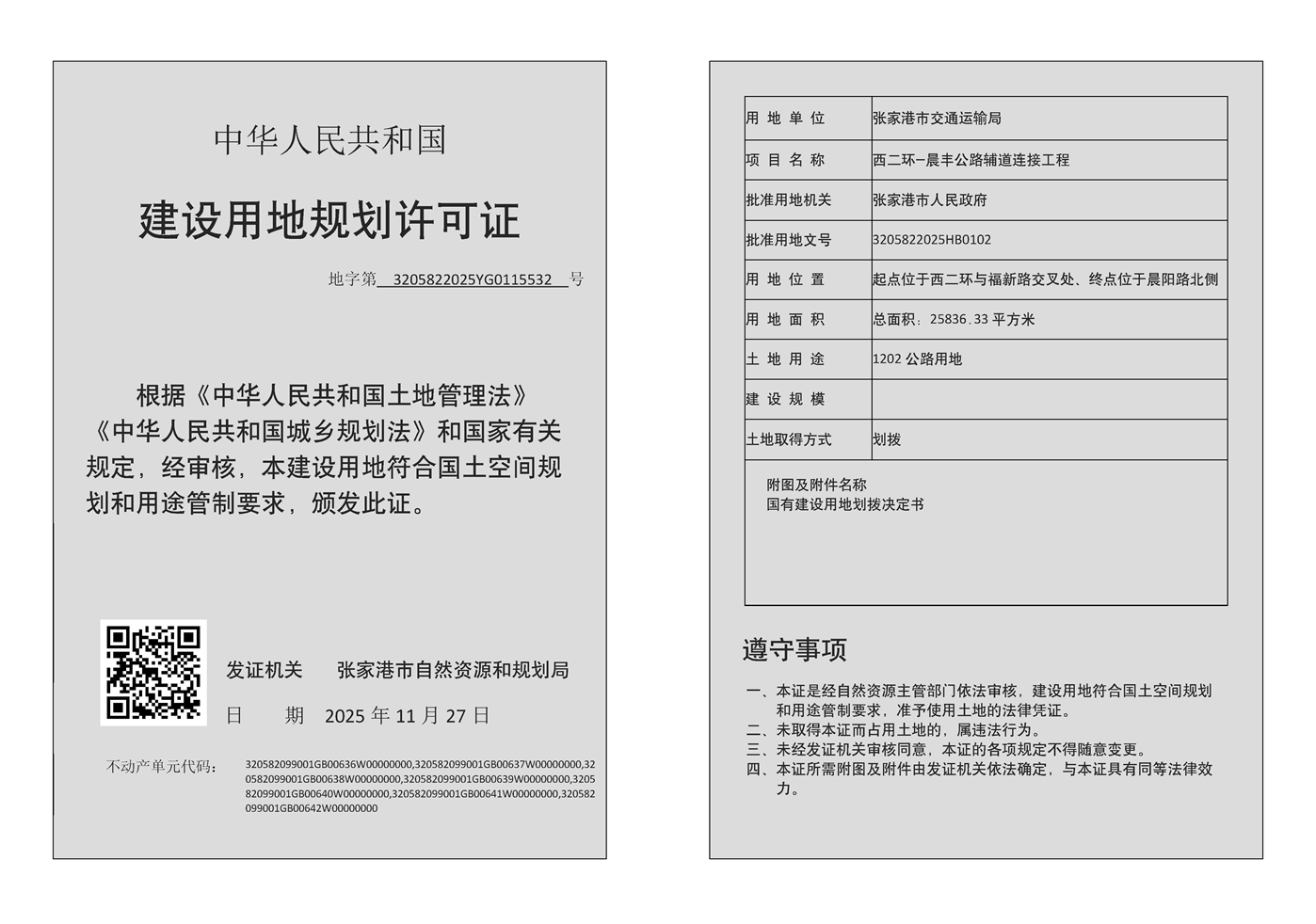 建設(shè)用地規(guī)劃許可證:張家港市交通運(yùn)輸局西二環(huán)-晨豐公路輔道連接工程