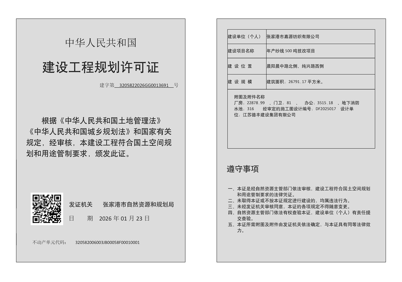 建設(shè)工程規(guī)劃許可證:張家港市嘉源紡織有限公司年產(chǎn)紗線 500 噸技改項目