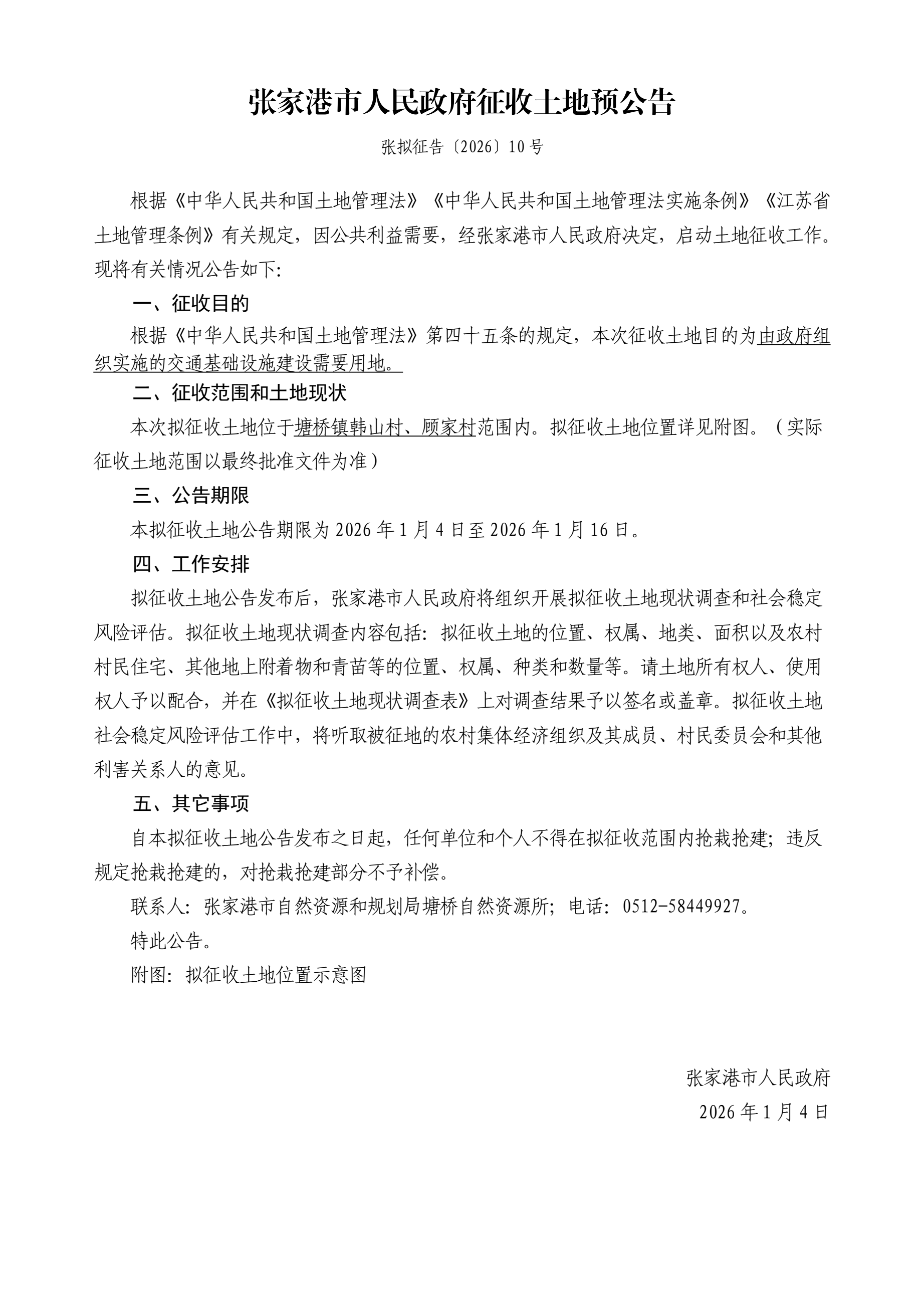 征收土地預公告(張擬征告[2026]10號)