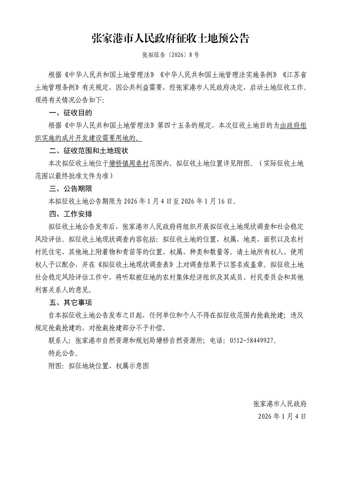 征收土地預公告(張擬征告[2026]1號、2號、3號、4號、5號、6號、7號、8號)