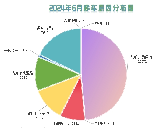 經分析發現,主要的移車原因是阻礙車輛通行、阻礙車輛通行、占用消防通道等。6月共計受理影響人員通行類移車20572件,占比48.47%,阻礙車輛通行類移車7612件,占比17.94%,占用消防通道類移車5092件,占比12.00%。