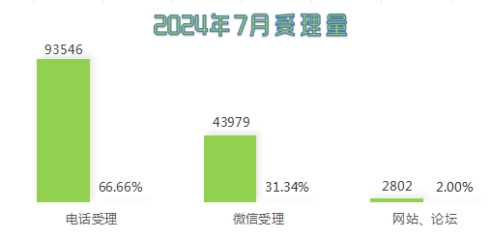 7月,市指揮平臺(12345熱線)共受理市民訴求140327件,環比增長14.06%(6月受理123031件)。其中電話受理93546件,占66.66%;微信受理43979件,占31.34%;網站、論壇等渠道受理2802件,占2.00%。