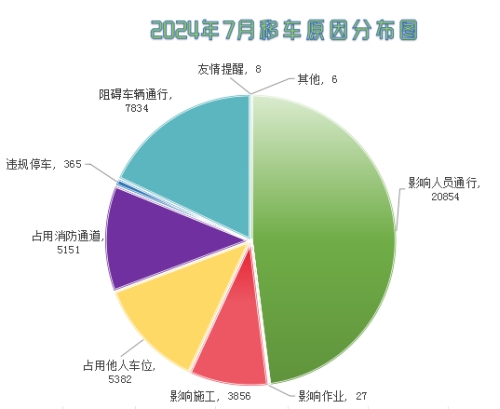 經分析發現,主要的移車原因是阻礙車輛通行、阻礙車輛通行、占用消防通道等。7月共計受理影響人員通行類移車20854件,占比47.96%,阻礙車輛通行類移車7834件,占比18.02%,占用他人車位類移車5382件,占比12.38%。
