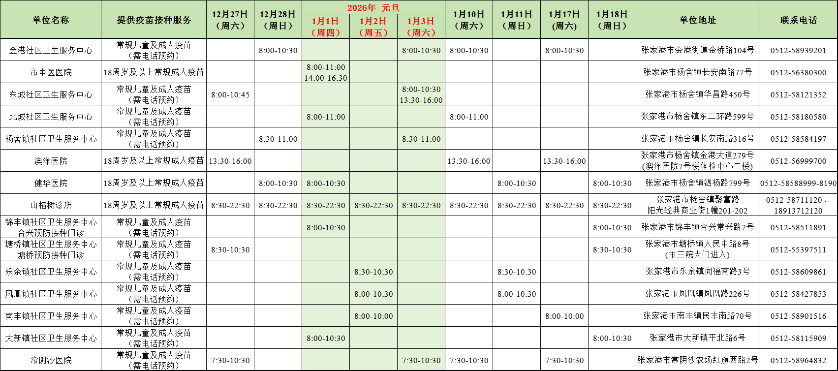 張家港市流感疫苗接種周末/節假日門診安排