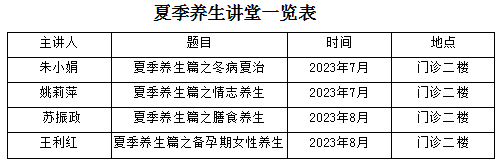 夏季養生節期間,將在張家港市中醫醫院門診二樓開設夏季養生講堂,由資深中醫專家講授夏季養生常識,為您的健康保駕護航。