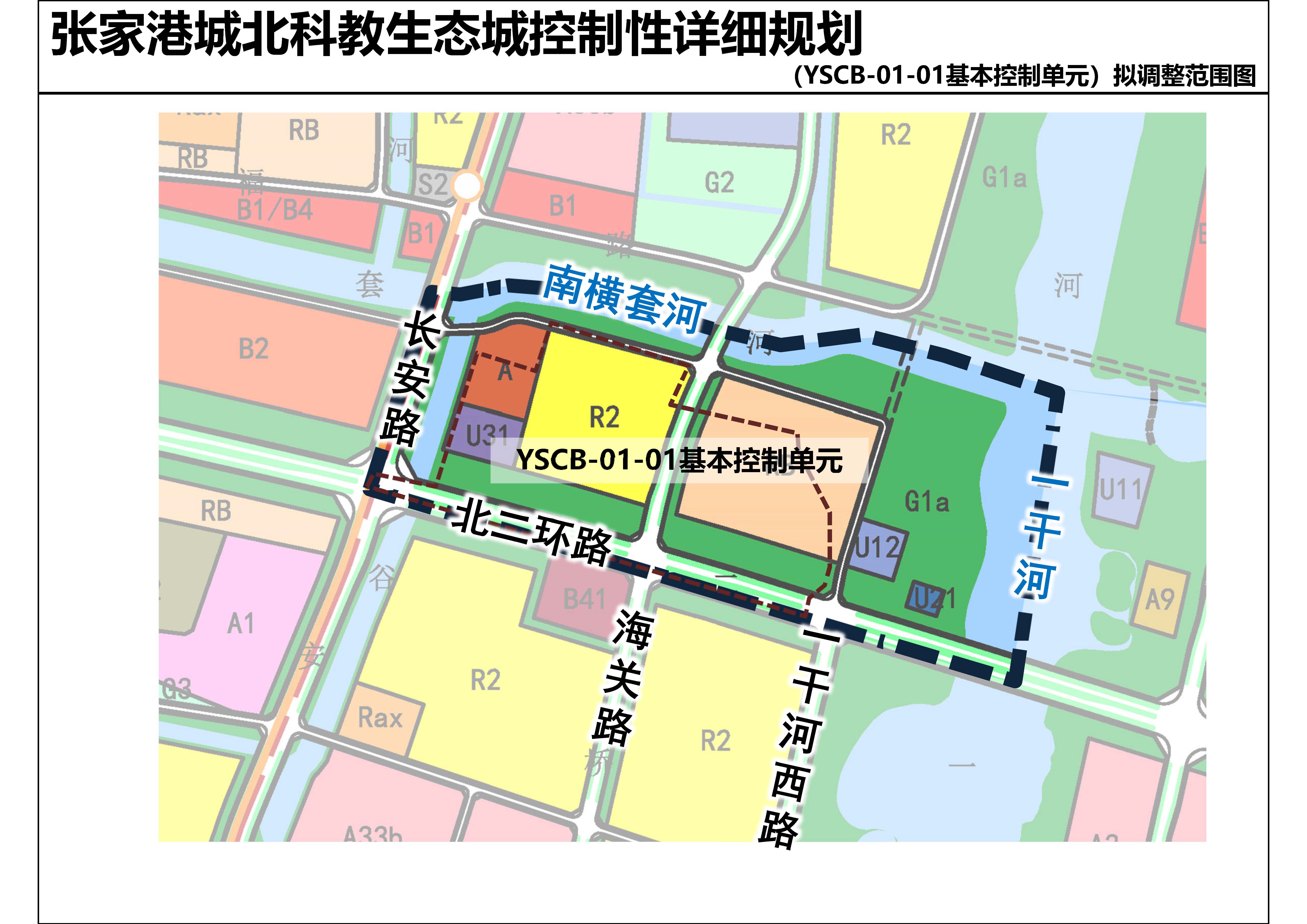 張家港城北科教生態城控制性詳細規劃(YSCB-01-01基本控制單元)擬調整范圍為東至一干河、南至北二環路、西至長安路、北至南橫套河,面積為32.08公頃,其中城鎮開發邊界內為13.10公頃。為了落實相關規劃,滿足片區開發建設和片區內公共服務設施需求,擬對控制單元內用地性質進行調整,主要調整內容為將北二環路北側公共管理與公共服務設施用地和消防用地調整為科研商業混合用地,商住混合用地調整為白地。